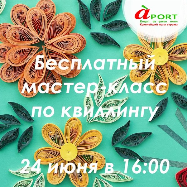 Дорогие друзья! 24 июня в 16:00 состоится мастер-класс по квиллингу. Квиллинг, также известен как бумагокручение — искусство изготовления плоских или объёмных композиций из скрученных в спиральки длинных и узких полосок бумаги. Ждем Вас в крупнейшем молл страны Апорт!