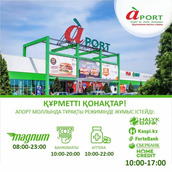 нда орналасқан кіреберістерден кіре аласыз. — Апорт моллы аумағында санитайзерлер орнатылған. — Кіреберісте тепловизормен тексеру жүргізіледі. Барлық сақтық шараларын сақтаңыз. Біз сіздерге зор денсаулық тілейміз! Сіздерге қамқорлықпен — Апорт моллыңыз ___________________ Дорогие гости, на территории молла Апорт продолжают работать: — Гипермаркет Magnum с 08.00 до 23.00*; — Аптека с 10.00 до 22.00; — Банкоматная группа с 10.00 до 20.00; — Отделение Halyk Bank с 10.00 до 17.00; — Отделение Kaspi Bank — с 10.00 до 17.00; — Отделение Forte Bank — с 10.00 до 17.00; — Отделение Sberbank Bank — с 10.00 до 17.00; — Отделение Home Credit Bank — с 10.00 до 17.00 Режим работы до 3 августа 2020 года*. Пройти на территорию молла вы сможете с входа расположеннего со стороны гипермаркета Magnum. — На территории молла Апорт установлены сенсорные санитайзеры. — На входе осуществляется проверка тепловизором всех гостей молла. Просим Вас соблюдать все необходимые меры предосторожности. Мы желаем Вам крепкого здоровья! С заботой о вас, ваш молл Апорт