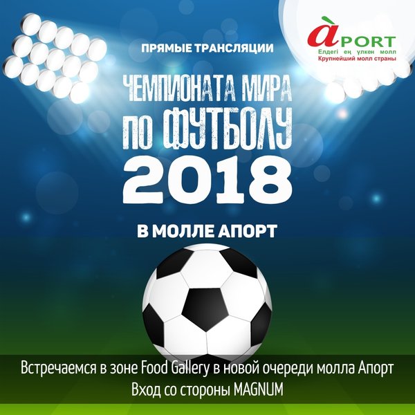 Дорогие друзья! Молл Апорт приглашает Вас на просмотр матчей Чемпионата Мира по футболу! Трансляции будут проходить каждый день в новой очереди молла, на площади Пьяцца, возле «фонтана желаний» Сегодня в 21:00 стартует матч Нигерия-Исландия! Ждем Вас на просмотр матчей в крупнейшем молле страны!!! ВСЕ НА ФУТБОЛ!