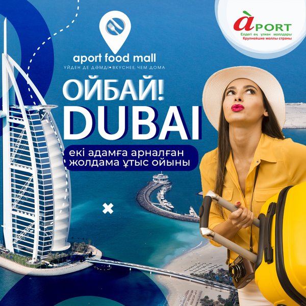 жолдама жеңіп алыңыздар! @foodmall_kz ___________ Выиграйте путёвку на двоих в Дубай с Aport Food Mall! Для участия необходимо: 1. С 21 июня по 15 августа совершить покупку на сумму от 2500 тг, в 12 новых ресторанах нового гастрономического пространства Aport Food Mall; 2. Заполнить предоставленный купон участника; 3. Опустить свой купон в лототрон. Розыгрыш состоится 15 августа 2021 г. Чем больше купонов, тем выше шанс на выигрыш! Становитесь участником розыгрыша и выиграйте незабываемый отдых на двоих в Дубай с Aport Food Mall! @foodmall_kz
