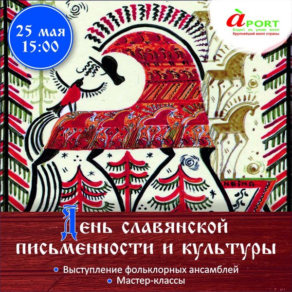 Что такое древнеславянская Буквица, как пишутся старинные буквы и какие народные промыслы существовали на Руси? Об этом и многом другом Вы сможете узнать 25 мая на Празднике Славянской Письменности в рамках Дней культуры в молле Апорт. В этот день специально для Вас выступление фольклорных ансамблей Русского культурного центра г. Алматы, познавательные программы, а также более 10 разнообразных мастер-классов для самых любознательных. Окунитесь в атмосферу самобытной культуры. Место проведения: Новая очередь молла Апорт «Пьяцца» Дата: 25 мая… — Читать дальше