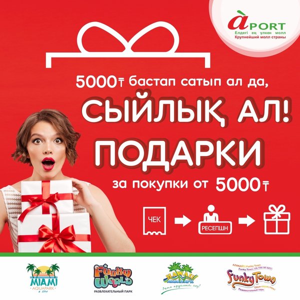 дарки вам, нашим гостям, за ваши покупки ⠀ Совершайте покупки в молле Апорт: — от 5000 тенге в гипермаркете Магнум; аквапарках Miami или Hawaii; развлекательных парках Funky Town или Funky World. — от 15 000 тенге во всех магазинах; — от 35 000 тенге в магазинах техники и магазине Евромебель. Обменивайте чеки на ГАРАНТИРОВАННЫЕ подарки на стойках ресепшн С любовью, Ваш молл Апорт