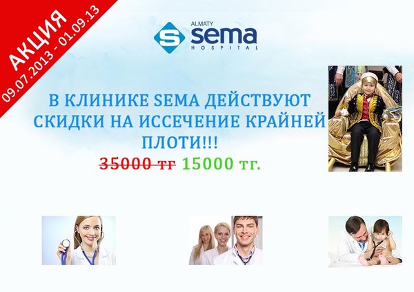 Уважаемые казахстанцы, поздравляем вас с священным месяцем Рамазан! В честь этого события в клинике СЕМА объявляется АКЦИЯ! Проведение процедуры «Сундет» (иссечение крайней плоти) в клинике Сема со скидкой 60%!!!