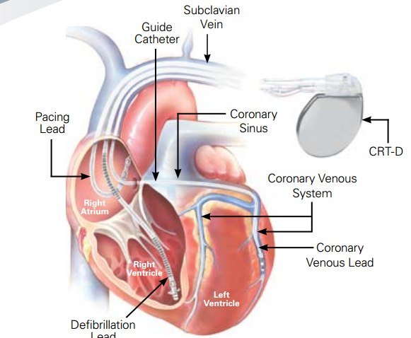 ульса (диссинхрония),что приводит к снижению насосной функции сердца и увеличению потребления энергии миокардом. СРТ называют синхронизированную стимуляцию правого и левого желудочков с предсердным ритмом, которая позволяет корригировать внутрисердечное проведение с целью устранения (или минимизации) механической диссинхронии сердца. В итоге возрастает производительность сердца и снижается выраженность ХСН. Стимуляция осуществляется посредством электрокардиостимулятора (ЭКС) с тремя стимулирующими электродами. Два из них — это обычные стимуляционные электроды, традиционно расположенные в правом предсердии и правом желудочке (ПЖ). Третий электрод предназначен для стимуляции левого желудочка (ЛЖ). Системы CРT с встроенным дефибриллятором (CRT-D) не только синхронизируют сердечный ритм, но также устраняют опасную для жизни тахикардию/фибрилляцию желудочков.