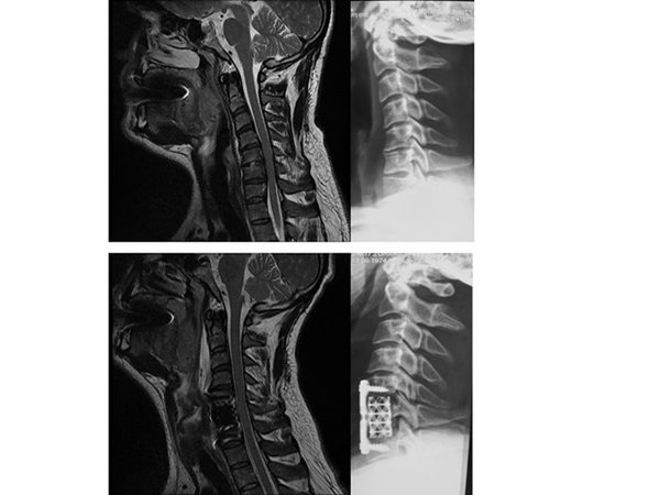 танового кейджа (сетки) и передней фиксацией титановой пластиной. Предоперационный и послеоперационный МРТ и рентгеновские результаты пациента