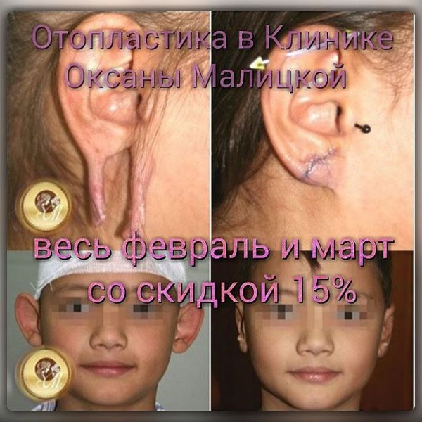 е ушных раковин на сегодняшний день довольно высока. Показания к отопластике Пластика ушных раковин успешно исправляет следующие эстетические дефекты: врожденная лопоухость (оттопыренные уши), посттравматические дефекты, чересчур большие ушные раковины или мочки ушей. Специалисты рекомендуют делать операцию по отопластике еще в детстве. Самый подходящим возрастом является период между пятью и семью годами. Впрочем, пластику ушных раковин успешно проводят и подросткам, и даже взрослым. В связи с 45-летним Юбилеем врачебно-косметологической Клиники Оксаны Малицкой – с 1 февраля 2017 г. по 31 марта 2017 г. объявляется беспрецедентная акция!!! Вас ждут ЕЖЕДНЕВНЫЕ скидки в размере 15% на прием всех врачей-специалистов Клиники! Скидка 15% на удаление новообразований! И самое главное — 30%-ная скидка НА ВСЕ виды пластических операций!!! Запись по телефонам: тел.)
