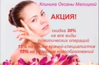 В связи с 45-летним Юбилеем врачебно-косметологической Клиники Оксаны Малицкой с 1 февраля 2017 г. по 31 марта 2017 г. объявляется беспрецедентная акция!!! Вас ждут ЕЖЕДНЕВНЫЕ скидки в размере 15% на прием всех врачей-специалистов Клиники! Скидка 15% на удаление новообразований! И самое главное — 30%-ная скидка НА ВСЕ виды пластических операций!!! Запись по телефонам: тел.)