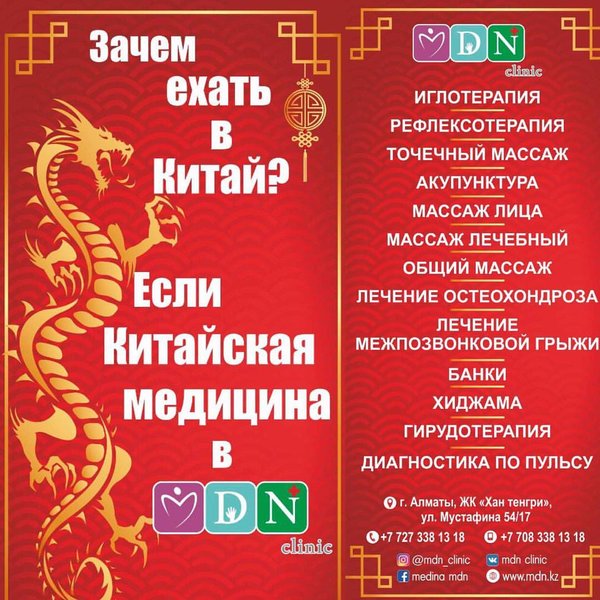 Если у вас хронические боли в пояснице, в шейном отделе позвоночника, хронический остеохондроз, межпозвонковая грыжа, сколиоз, или просто хотите получить качественный лечебный массаж то лучше обратиться В MDN clinic. Прием ведет врач Иглотерапервт, Китайской восточной медицины, владеет техникой точечного массажа, хиджамой, акупунктурой. Если есть Дополнительные вопросы можете позвонить по тел: 3381318 ЖК «Аль-Фараби»