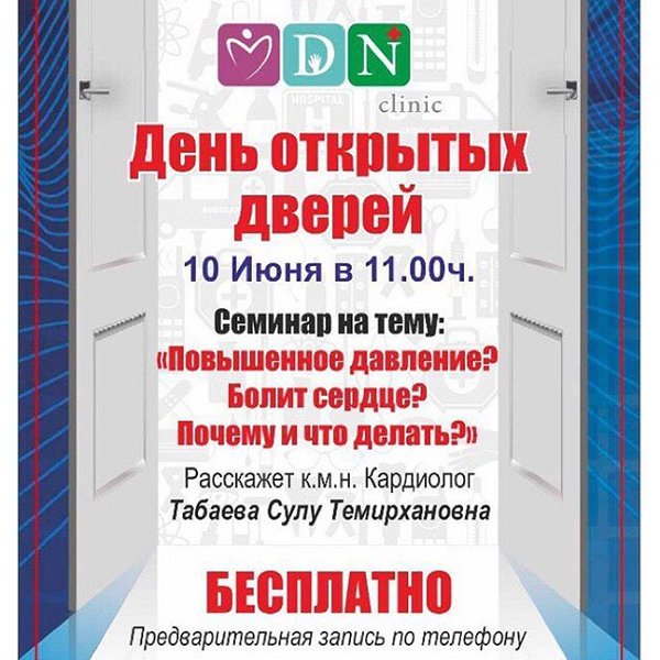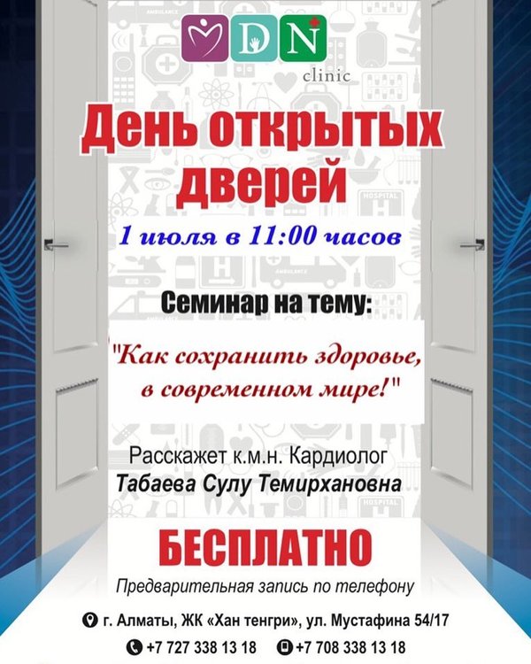 Дорогие жители жк ХТ, АскарТау, приглашаем всех на день открытых дверей в субботу 10 июня, где врач кардиолог к.м.н Dph Сулу Тимирхановна поднимет вопрос причины «Повышения давления, болей в сердце ️!» Кому важно свое здоровье, кто хочет качественную и долгую жизнь добро пожаловать, будет интересно, ⏰ время 10 июня (суббота) в 11:00 место жк Хан-Тенгри Мустафина 54/17 «MDN clinic» @ Жилой комплекс Хан-Тенгри