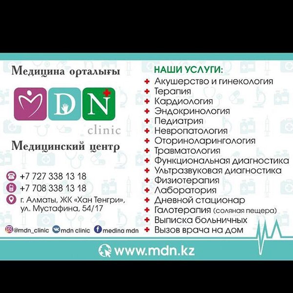 MDN clinic открыт для всех и предлагает услуги узких специалистов: акушерство и гинекология, педиатрия, невропатология взрослая и детская, эндокринология, кардиология, УЗИ диагностика, лаборатория. @ Хан Тенгри