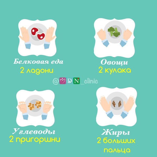 Худеем правильно, например : рацион рассчитан на женский организм * открытая ладонь соответствует дневной порции кусочка мяса любого (говядина, баранина без жира, филе курицы, рыба) * Сжатый кулак по объему определяет фрукты, ягоды, овощи * Дневной нормой углеводов считается передняя часть кулака (рис, крупы, макароны) * жиры неотъемлемая часть человеческого рациона поэтому в день она должна составлять размер фаланги большого пальца (масло, ореховое масло, шоколад) мцхантенгри