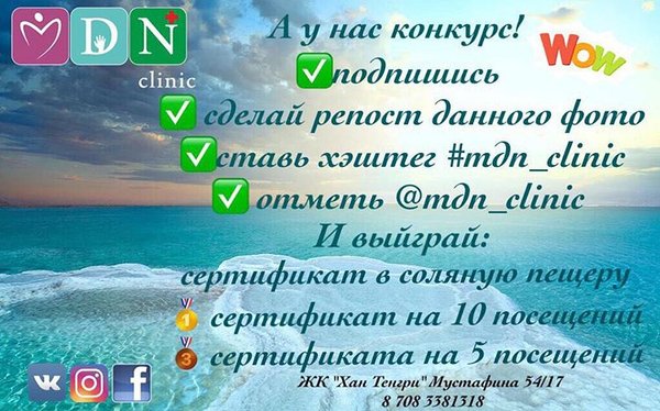 А у нас конкурс! Сделай репост и выиграй сертификат в соляную пещеру! Для участия: будь подписчиком @mdn_clinic сделай репост этой фотографии и записи у себя на странице поставь хэштег #mdn_clinic отметь @mdn_clinic получи номер Важно! Принимают участие только настоящие люди с настоящей страничкой. 1 сертификат на 10 посещений 3 сертификата на 5 посещений Наш Адрес: Мустафина 54/17 ЖК «Хан Тенгри», 338 13 18 УДАЧИ ВСЕМ дорогие друзья! Дата закрытия конкурса: 25 апреля в 12:00 Победителя определит генератор числа: 25 апреля в 13:00 @ Жилой комп… — Читать дальше
