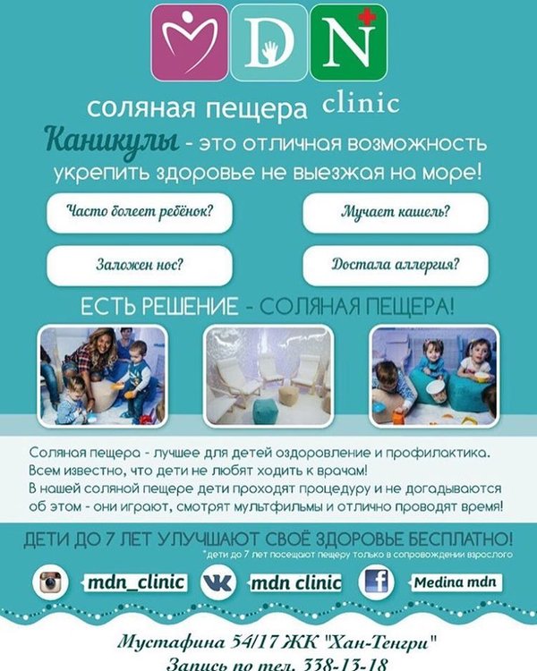 До конца каникул осталось всего ничего 10 дней! Хочется новый учебный год начать со здоровым окрепшим организмом, в осенний период выстоять все вирусные и бактериальные инфекции? Тогда Тебе к Нам, в Соляную пещеру, 7—10 сеансов очищенного микроионизированного климата, поддержит иммунитет в борьбе с инфекцией верхних дыхательных путей. Жилой комплекс Хан-Тенгри