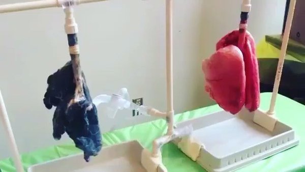 На видео представлены легкие человека курящего 2 пачки в день в течении 20 лет и справа здоровые легкие.