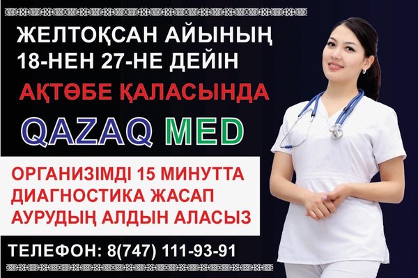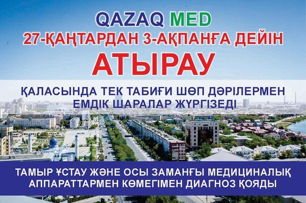 АТЫРАУ ОБЛЫСЫНЫҢ ТҰРҒЫНДАРЫ АРНАЙЫ СІЗДЕР ҮШІН ҚАЗАҚТЫҢ ДӘСТҮРЛІ ЕМІМЕН ЕМДЕЙТІН «QAZAQ MED» ОРТАЛЫҒЫ: 20- СӘУІРДЕН 27- СӘУІРГЕ ДЕЙІН ТАМЫР ҰСТАУ АРҚЫЛЫ ДИАГНОЗ ҚОЙЫП, ТЕК ТАБИҒИ ШӨП ДӘРІЛЕРМЕН ЕМДІК ШАРАЛАР ЖҮРГІЗЕДІ! ЕМДЕУ ЖОЛДАРЫ: 1. ХИДЖАМА 2. МАССАЖ 3. ИНЕ САЛУ 4. ОТМЕН ЕМДЕУ 5. ЖӘНЕ ӘР АДАМНЫҢ ОРГАНИЗІМІНЕ АРНАЛҒАН ТАБИҒИ ШӨП ДӘРІЛЕР! Асығыңыздар, орындар саны шектеулі! Байланыс телефонымыз: 8-747-111-93-91 8-700-600-88-88 8-702-498-86-02 8-747-521-80-24