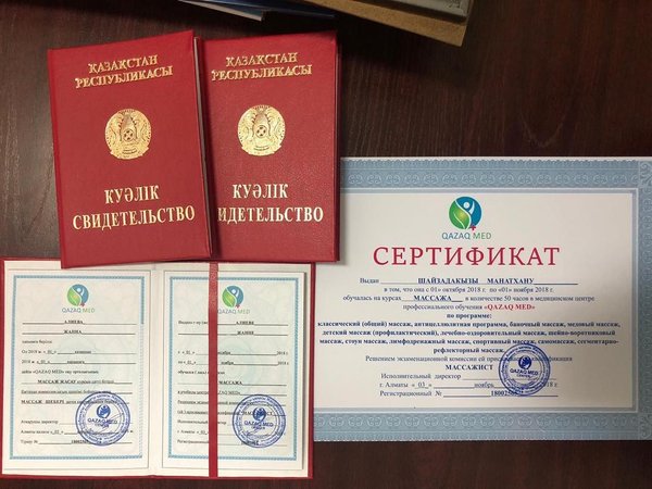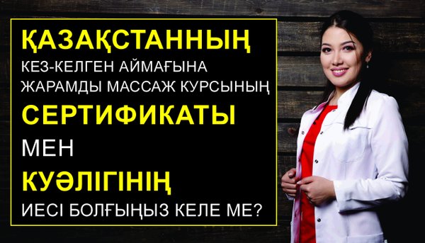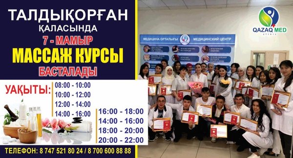 ТАЛДЫҚОРҒАН қаласының тұрғындары ⏳Қысқа уақыт аралығында массаждың қыр-сырын үйреніп, Қазақстанның кез келген аймағына жарамды: СЕРТИФИКАТ ПЕН ДИПЛОМНЫҢ ИЕСІ атаңғыңыз келе ме? Онда «QAZAQ MED«орталығының білікті мамандары: 5 — 11 МАУСЫМ аралығында сiздер үшін 12 түрлі массаж түрін үйретедi! Курс таңғы 8:00 — кешкі 22: 00 аралығында болады! Бағасы: 40 000 тг; Студенттерге: 30 000 тг; Ертерек қабылдауға жазылуға асығыңыздар, орындар санаулы))) Арнайы сертификат пен дипломға ие боласыз! Ватсап