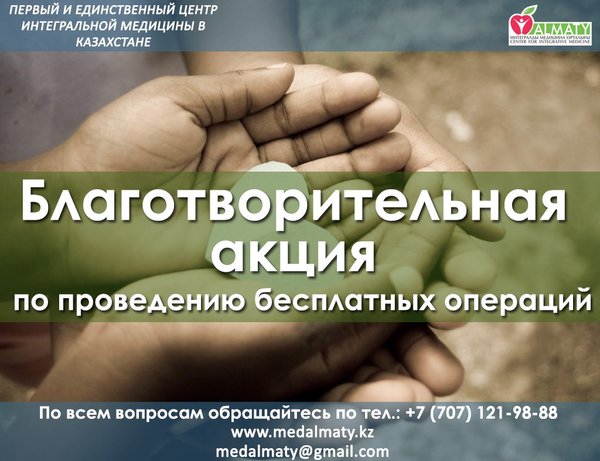 Дорогие друзья! Центр Интегральной Медицины Алматы в рамках благотворительной акции проводит отбор пациентов (детей и взрослых) для проведения операций при следующий заболеваниях : — Рак мозжечка — Медуллобластома; — Эпендимома; — Астроцитома; — Тектальная опухоль. — Врожденный акведуктальный стеноз. Операции будет проводить известный нейрохирург из Южной Кореи, профессор Ян Гук. Присылайте снимки головного мозга, медицинские заключения и контактную информацию на адрес medalmaty@gmail.com. По всем вопросам звоните по телефону