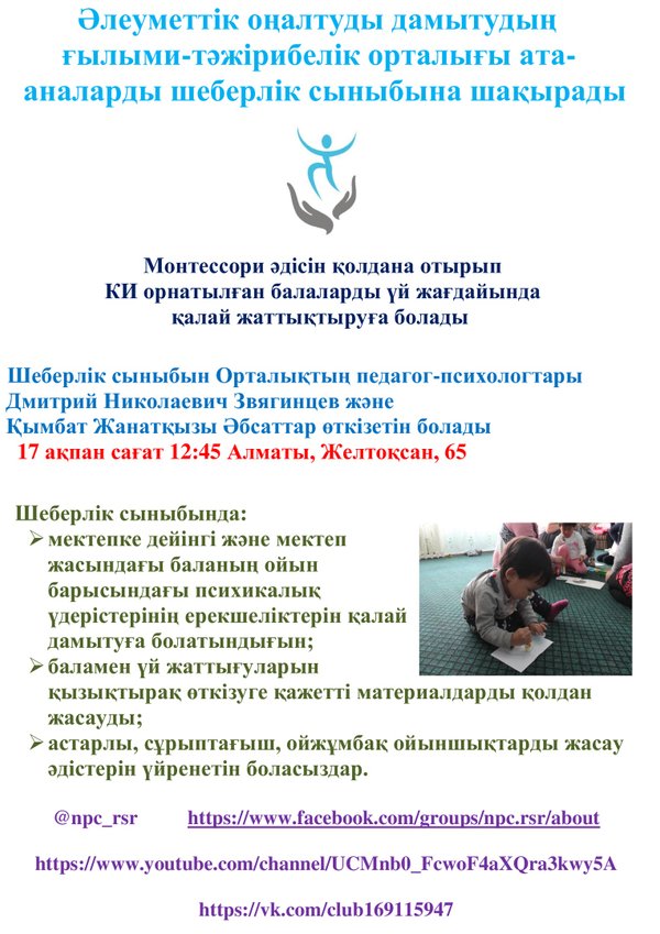 Шеберлік сыныбын Орталықтың педагог-психологтары Дмитрий Николаевич Звягинцев және Қымбат Жанатқызы Әбсаттар өткізетін болады Өтетін орны: Алматы қаласы, Желтоқсан, 65 көшесі ______________________________________________________________________ 17 февраля в 12:45 в Научно-практическом центре развития социальной реабилитации пройдет мастер-класс для родителей на тему «Как организовать занятия родителям детей с роди кохлеарными имплантами в домашних условиях с применением метода Монтессори» Во время мастер-класса, Вы узнаете: — как развивать особенности психических процессов во время игры у детей дошкольного и школьного возраста; — научитесь создавать своими руками интересные материалы для занятия с ребенком в домашних условиях; — узнаете как создать вкладыши, игрушки-сортеры, головоломки для своего ребенка. Мастер-класс проведут педагоги-психологи Дмитрий Николаевич Звягинцев и Қымбат Жанатқызы Әбсаттар Место проведения: г.Алматы, ул.Желтоксан, 65
