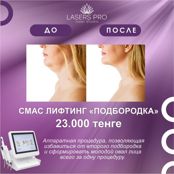 ого лицевого нерва. Результаты очевидны уже за 1 час, это: 1. Контур линии лица станет четким 2. Происходит подтяжка глубоких слоев мягких тканей лица 3. Разгладятся мимические морщины, 4. Глубокие носогубные складки станут менее заметные 5. Поднимутся уголки рта, бровей, верхнее веко 6. Уйдут последствия фотостарения 7. Эффект держится до 3 лет. В течение 2—3 месяцев Вы будете замечать нарастающий лифтинг кожи. 8. Нарастающий эффект КАКОЙ ЭФФЕКТ ОТ ПРОЦЕДУРЫ? С помощью этой процедуры можно сделать контур лица гораздо четче, подтянуть глубокие слои кожи. Уже после первого сеанса заметно сокращаются морщины, исчезают «гусиные лапки» и темные круги под глазами. Также во время процедуры реально убрать носогубные складки, приподнять уголки рта и бровей, избавиться от последствий фотостарения кожи. С помощью SMAS лифтинга реально добиться хорошего anti-age эффекта. — ЖМИТЕ КНОПКУ «ПОДАТЬ ЗАЯВКУ» - г.Алматы ул. Наурызбай Батыра 47 (между ул. Айтеке би/ ул. Гоголя) Запись на процедуру по номеру: whatsapp