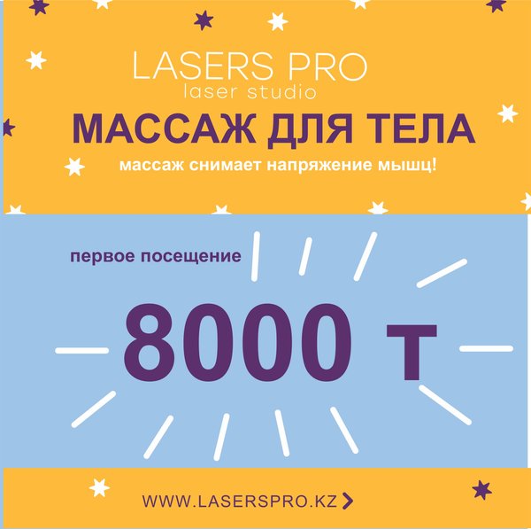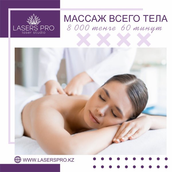 аж швз — 10 сеансов - 25.000 тг (30 мин) 3. Массаж спины — 10 сеансов - 40.000 тг (40 мин) 4. Оздоровительный массаж тела -10 сеансов - 70.000 тг (80 мин) 5. Лимфодренажный массаж тела — 10 сеансов - 60.000 тг (70 мин) 6. Коррекция фигуры (живот, бока) — 10 сеансов - 25.000 тг (30 мин) 7. Коррекция фигуры (ягодицы, ноги) — 10 сеансов - 35.000 тг (40 мин) 8. Коррекция фигуры (ягодицы, ноги, живот, бока, руки) 10 сеансов - 55.000 тг (90 мин) 9. Коррекция фигуры (ягодицы, ноги, живот, бока, руки)15 сеансов - 65.000 тг (90 мин) ОСТАВЛЯЙТЕ ЗАЯВКУ, МЫ ВАС ЗАПИШЕМ! . «Lasers Pro» Студия лазерной эпиляции. Адрес г.Алматы ул. Наурызбай Батыра 47 (между ул. Айтеке би/ ул. Гоголя) Телефоны для записи+whatsapp) +. Адрес г.Алматы ул. Жамбыла, 169 (на пересечении ул. Жамбыла и ул. Манаса) Телефоны для записи whatsapp).