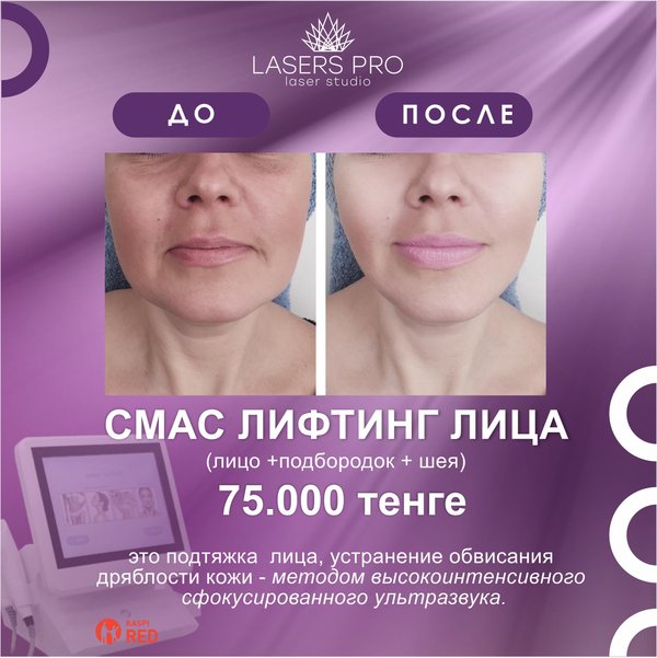 ого лицевого нерва. Результаты очевидны уже за 1 час, это: 1. Контур линии лица станет четким 2. Происходит подтяжка глубоких слоев мягких тканей лица 3. Разгладятся мимические морщины, 4. Глубокие носогубные складки станут менее заметные 5. Поднимутся уголки рта, бровей, верхнее веко 6. Уйдут последствия фотостарения 7. Эффект держится до 3 лет. В течение 2—3 месяцев Вы будете замечать нарастающий лифтинг кожи. 8. Нарастающий эффект КАКОЙ ЭФФЕКТ ОТ ПРОЦЕДУРЫ? С помощью этой процедуры можно сделать контур лица гораздо четче, подтянуть глубокие слои кожи. Уже после первого сеанса заметно сокращаются морщины, исчезают «гусиные лапки» и темные круги под глазами. Также во время процедуры реально убрать носогубные складки, приподнять уголки рта и бровей, избавиться от последствий фотостарения кожи. С помощью SMAS лифтинга реально добиться хорошего anti-age эффекта. Укажите ваш сотовый телефон, и мы вас проконсультируем! Для вашего удобства у нас действует КАСПИ РЕД. — ЖМИТЕ КНОПКУ «ПОДАТЬ ЗАЯВКУ» - г.Алматы ул. Наурызбай Батыра 47 (между ул. Айтеке би/ ул. Гоголя) Запись на процедуру по номеру: whatsapp