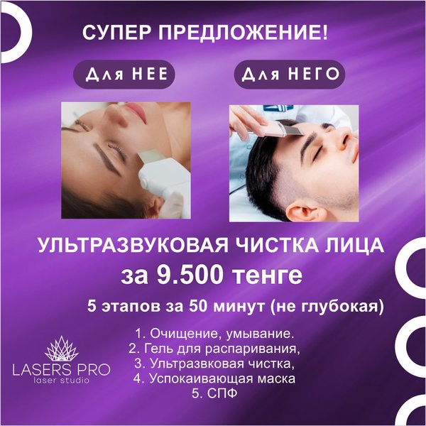 ложенности к образованию шрамов и келоидных рубцов на коже; 7. если у клиента есть заболевания сердечнососудистой системы; 8. при интенсивных проявлениях акне и угревой болезни; 9. во время приёма пациентом лекарств, которые влияют на свёртываемость крови; 10. при воспалениях участка кожи, подлежащего обработке ультразвуком, наличии в организме хронических или острых заболеваний, провоцируемых инфекцией; 11. при склеродермии, красной волчанке; 12. для лиц, не достигших 18-ти лет. -------------------------— «Lasers Pro» Студия лазерной эпиляции -------------------------------------— Адрес: г.Алматы ул. Наурызбай Батыра 47 (между ул. Айтеке би/ ул. Гоголя) Телефоны для записи: +whatsapp) + — Адрес: г.Алматы ул. Жамбыла, 169 (уг.ул. Манаса) Телефоны для записи: + + + whatsapp) ---------------------------------------------— Режим работы: Пн, Вт, Ср, Чт, Пт, Сб, Вс — с 09:00 до 20:00 -