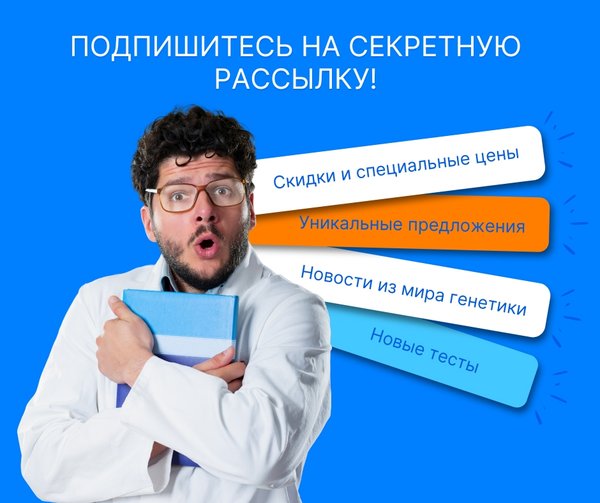 Подпишитесь на рассылку — узнавайте первыми о скидках, новых видах тестирования и интересных новостях из мира генетики. Переходите по ссылке: