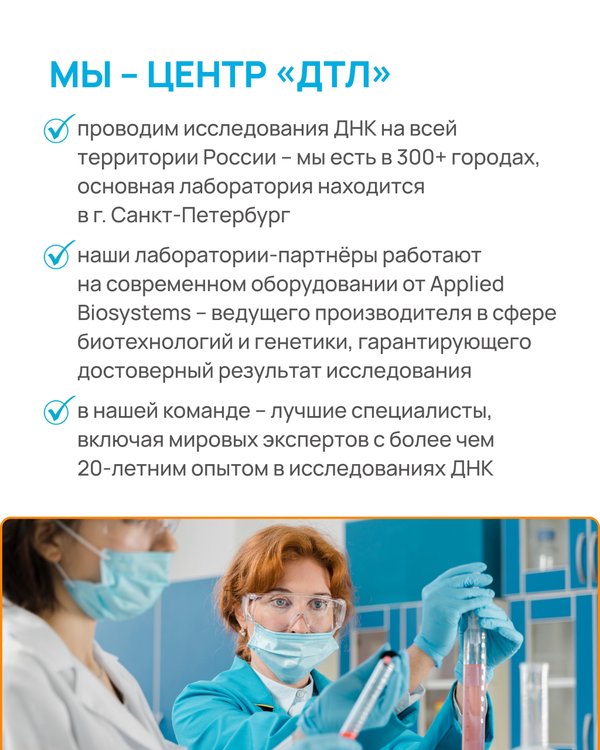 оманде — эксперты мирового уровня, каждый из которых имеет более 15 лет практики в области ДНК-технологий. Центр «ДТЛ» — это самые точные ДНК-тесты на сегодняшний день. Мы готовы помочь вам разобраться в любых вопросах, связанных с генетикой! Узнайте больше и получите консультацию в личных сообщениях сообщества