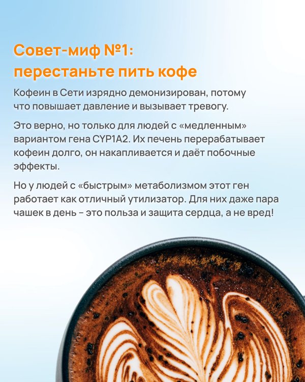 твет кроется в том числе в вашей генетике! «Универсальные» советы обычно рассчитаны на «среднего человека» которого в природе вообще-то не существует. ⠀ Давайте разберём некоторые популярные мифы, которые легко разбиваются о ДНК-тесты листайте → ⠀ ー ⠀ Остались вопросы? Можно задать их в комментариях к публикации или написать в ЛС! ⠀ Больше подробностей о ДНК-исследованиях в Центре «ДТЛ» – на нашем сайте: