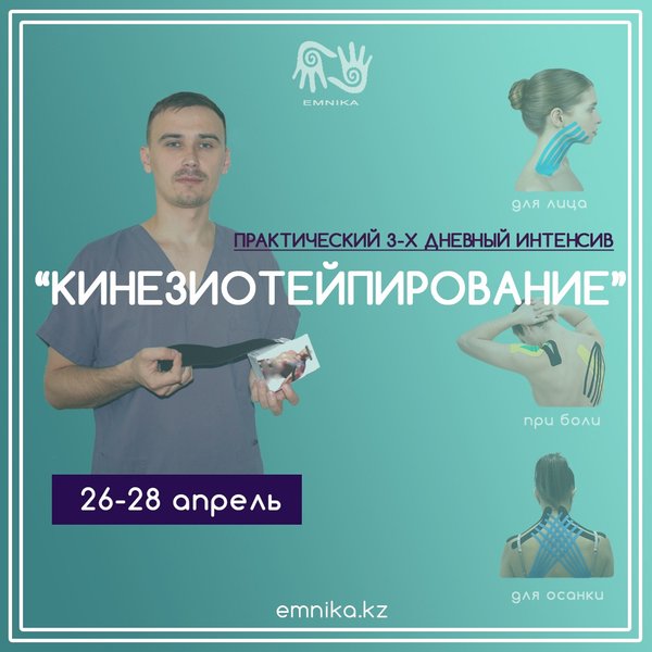 26,27,28 апреля 3-х дневный практический интенсив «Кинезиотейпирование». Продолжительностью 24 часа: пятница, суббота, воскресенье с 10:00ч до 18:00ч. Стоимость 60000тг. Выдача сертификата.