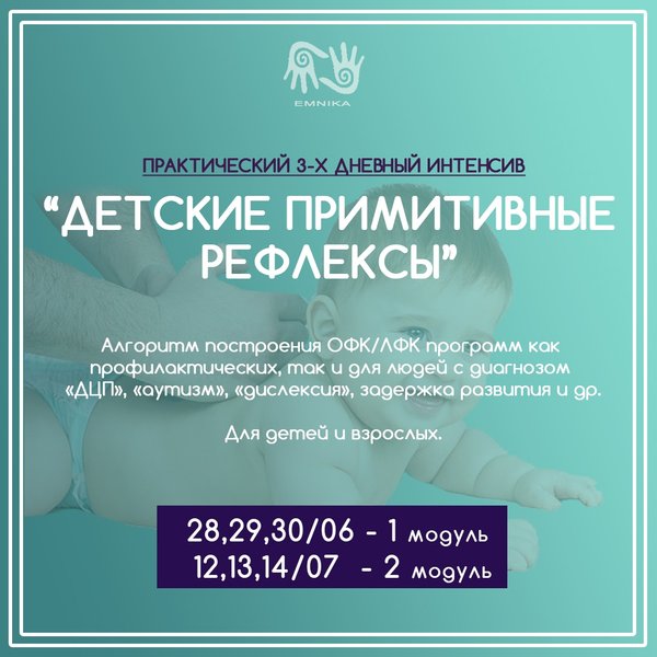 программу курса можно посмотреть на сайте emnika.kz (Обучение). На курсе даются инструменты по работе с неврологическими и структурными аспектами здоровья. А так же работа с примитивными рефлексами. Программа обучения разделена на 2 модуля, для более лёгкого усвоения материала. Ведущий семинара Москалёв Егор Георгиевич — кинезиолог, преподаватель. 9 лет практики в реабилитации проблем ОДА с применением техник ПК, остеопатии, P-DTR, психо-неврологической интеграции. Основатель центра здоровья EMNIKA и автор курсов «Нейро-энергопсихология», » Примитивные рефлексы», «Висцеральная терапия», » Рефлекторная гимнастика». По окончанию обучения вы будете иметь ценнейший раздаточный материал, алгоритм построения ОФК/ЛФК программ, как профилактических, так и для людей с диагнозом «ДЦП», «аутизм», «дислексия» задержка развития, а так же научитесь тестировать и перезагружать нервную систему. Работать на неврологических и структурных уровнях здоровья