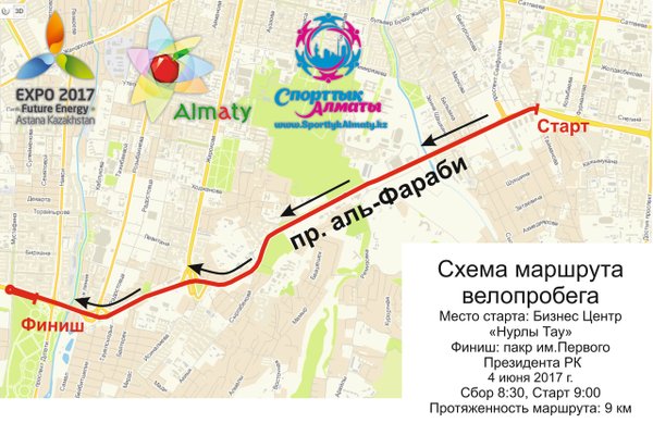 для участников. ⠀ В этот раз они проедут 9 км по проспекту Аль-Фараби в сторону парка Первого президента РК. На финише по традиции будет разыгрываться множество ценных призов, главным из которых является велосипед. ⠀ Управление физической культуры и спорта Алматы напоминает об обязательном требовании ко всем участникам – иметь защитные шлемы в целях собственной безопасности. ⠀ Отметим, что данный велопробег, проводимый в рамках масштабной городской программы «Спорттық Алматы» станет шестым из 21 запланированных в этом году. Программа направлена на развитие массового спорта в мегаполисе и популяризации активного спортивного отдыха.