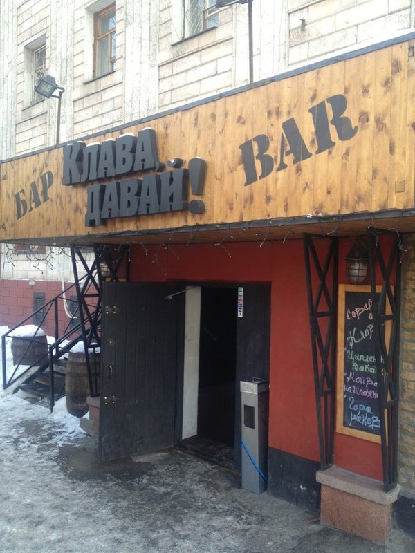 Бар с провокационным названием «Клава, давай!» уже одним этим девизом побуждает своих посетителей к безудержному веселью. Название отсылает гостей к старому американскому сериалу и к песне рок-группы «Сплин». Интерьер заведения, обставленный в духе коммунальных квартиры, где проживали наши мамы и бабушки, как будто переносит на несколько десятилетий назад — во времена Советского Союза — книги, мебель, техника и другие атрибуты тех лет. Старая печатная машинка, соленья и варенья, велосипед, на котором мог ездить дед — все это те замечательные детали, которые делают атмосферу бара «Клава, давай!» поистине уникальной. Музыка, звучащая в баре наоборот — весьма современная, ведь за пультом работают лучшие диджеи, а на сцене выступают с живым звуком музыкальные группы разного формата. Веселье здесь может продолжаться сколько угодно, ведь «Клава, давай!» работает до ухода последнего гостя. В заведении предлагаются блюда из кухни Европы, а возле здания есть парковка.