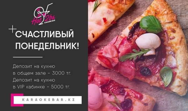 Дорогие гости, понедельник как говориться тяжелый день. Самое время насладиться позитивным пением и вкусно поужинать. Специально для вас Счастливый понедельник! Основной зал — депозит 3000 на меню кухни с персоны и никаких входных. VIP залы депозит 5000 на меню кухни с персоны и время дарим в подарок!