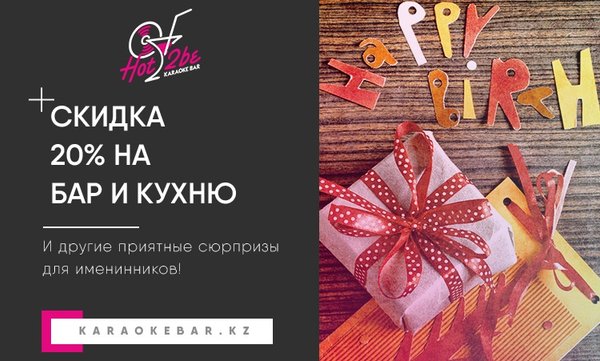 Мы приглашаем вас, отметить ваш лучший день в году с нами! С вас отличное настроение – с нас подарок в виде 20% скидки на меню, начисление Hot2be’shek на карту +