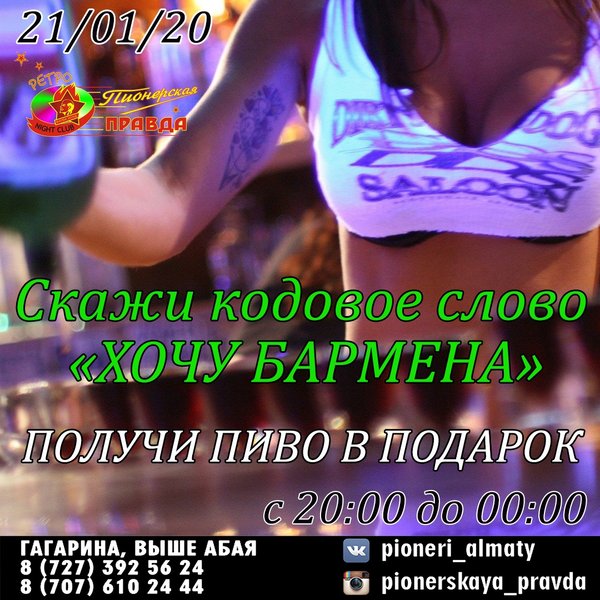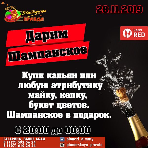 Ждем всех пионеров. Вход девушкам до 00:00 часов свободный. Принимаем каспи ред.