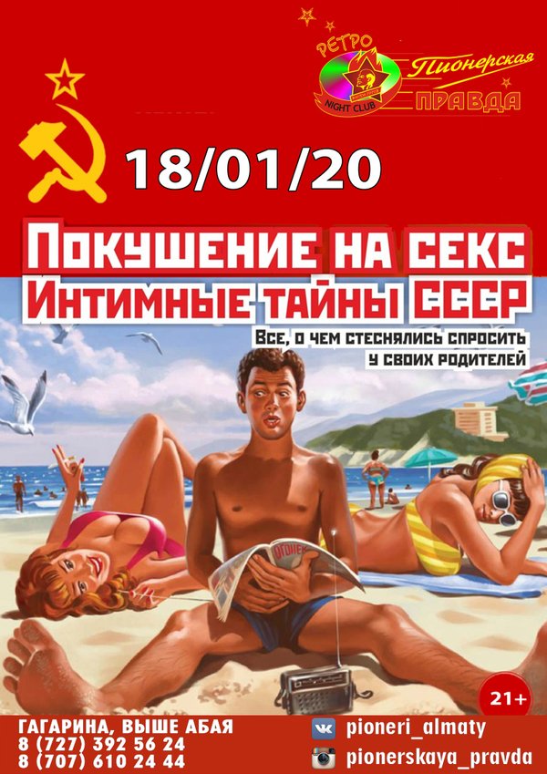 ь без сна, играет попса. Яркая, упругая шоу программа, конкурсы, призы и подарки. Розыгрыш сертификатов. Шевели булками, танцуй Twerk! 18 января 2020 «Интимные тайны СССР» Покушение на секс! Все, о чем стеснялись спросить у своих родителей. 25 января 2020 «БДСМ party» Будь Добр Со Мной 31 января 2020 «День Рождения Русской водки» Нашу веру не сломить: ПИЛИ, ПЬЕМ и БУДЕМ ПИТЬ! Конкурсы, призы и подарки! Розыгрыш сертификатов! Девушкам до 00:00 вход свободный!