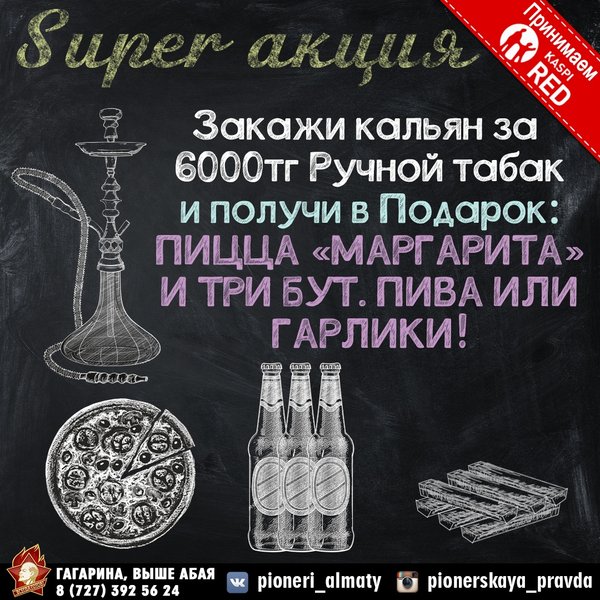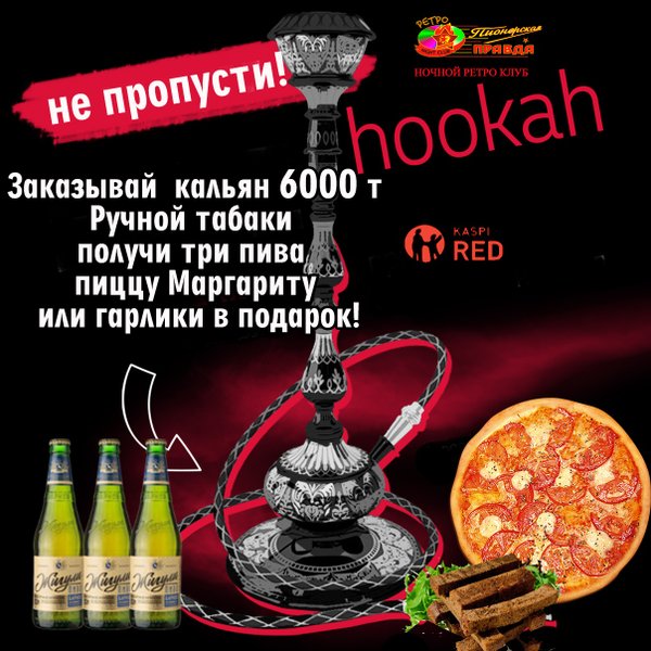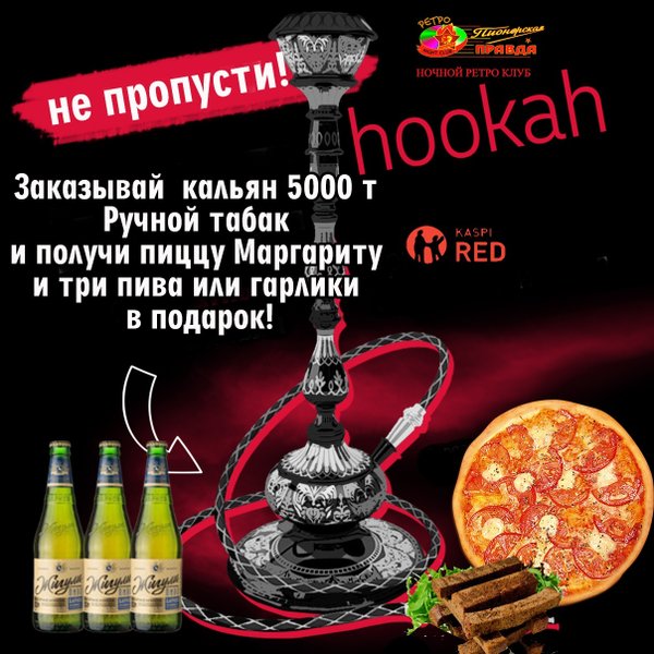 24.10.19. При заказе кальяна на сумму 5000 тг три бутылки пива и гарлики в подарок! Розыгрыш сертификатов на сумму 15000 тг.