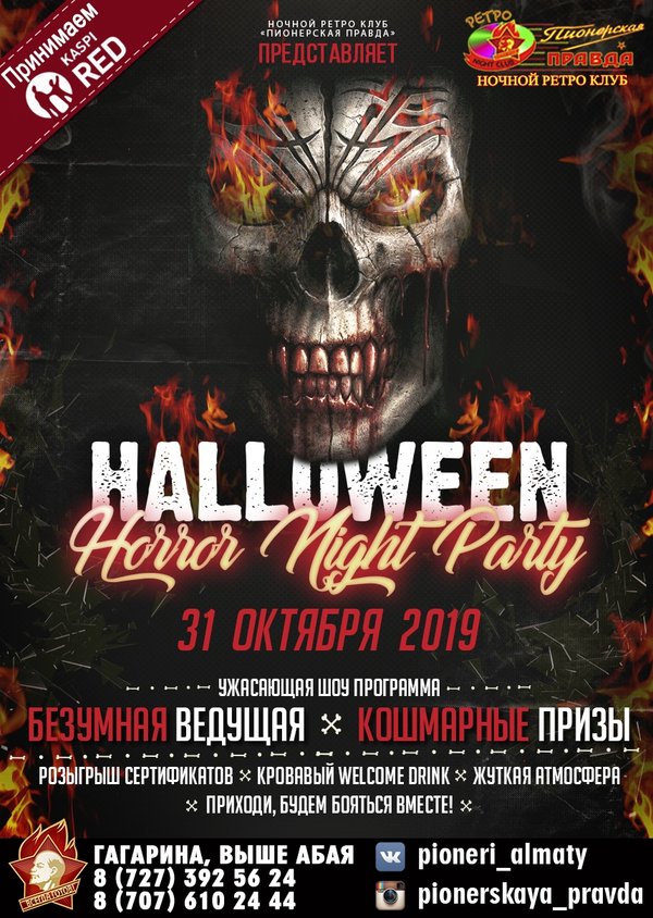 31 октября 2019 «Halloween. Horror night party» Ужасающая шоу программа. Безумная ведущая, кошмарные призы. Розыгрыш сертификатов, кровавый welcome drink, жуткая атмосфера. Приходи, будем бояться вместе!