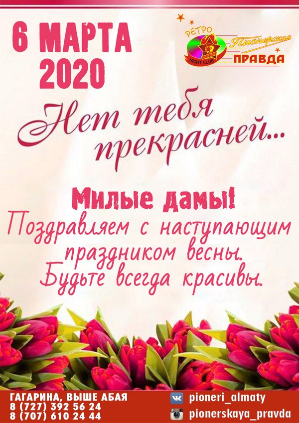 Всех с праздником. Ждем всех пионеров. Вход девушкам до 00:00 часов свободный.