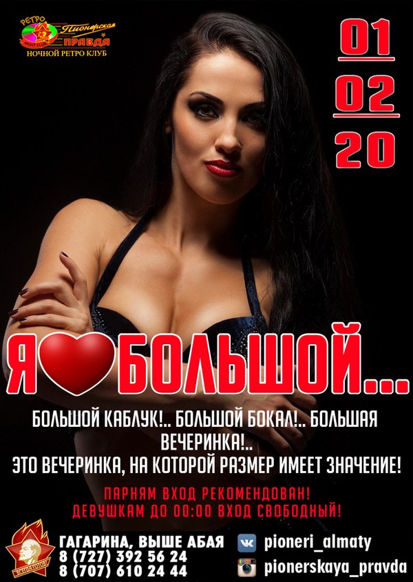 1 февраля 2020 «Я люблю большой » Большой каблук!..Большой бокал!..Большая вечеринка!.. Это вечеринка, на которой размер имеет значение! Парням вход рекомендован! Девушкам до 00:00 вход свободный!