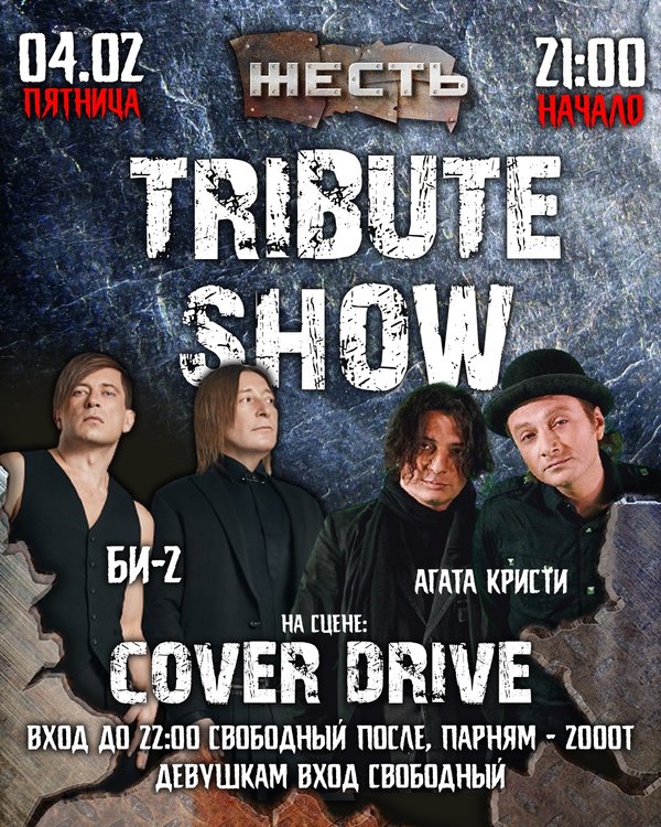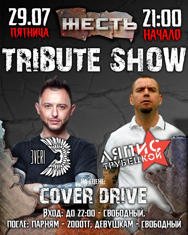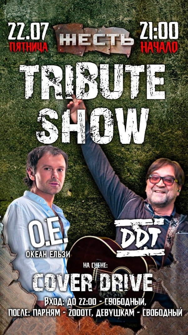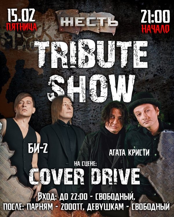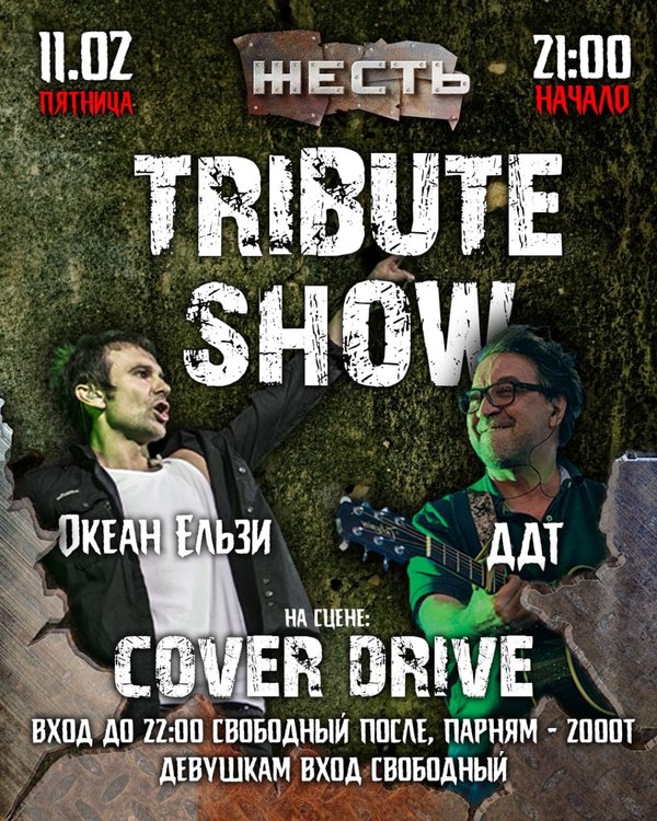 ому мне, вернее всем нам, команде твоего любимого рок-клуба, хотелось, чтобы эта неделя запомнилась тебе не новыми зарубками на ремне до приближающегося марта, но в предвкушений надвигающейся пятницы, которую ты, мой дорогой друг проведешь в компании единомышленников и адептов классического звучания и слов, что милее сердцу. И пусть они унесут тебя то место, где ты сможешь запомнить каждую деталь прожитой ночи! Где появиться желание «раздать всем по сердцу, ничего себе не оставив.» Где ты захочешь навсегда запечатлеть ту картину, и молча попросишь себя, «дать себi листок » 11.02.22. – 21:00 @zhest.club #trebutshow «Океан Ельзи» «Гр. ДДТ» На сцене: Cover Drive 21:00 – 22.00 #freeentrance 23.00 – 05.00 Мужчины – 2 000 kzt 21.00– 05:00 Девушки заходят бесплатно