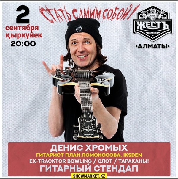 2 сентября в Алматы в клубе Жесть выступит легендарный московский гитарист Денис Хромых, участник таких культовых групп как Тараканы!, План Ломоносова и Tracktor Bowling. Вас ждёт гитарный стендап, творческая клиника, истории из туровой жизни, и, конечно же, живое исполнение самых громких хитов всех коллективов! Также будет преставлен новый сольный проект iksDen. Вход 5000 тг Начало в 20:00