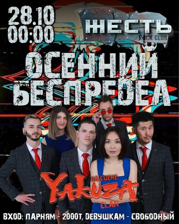 28.10.22. – 00:00 @zhest.club На сцене: Yakuza clan #dj DJ Nik.El Петр Оборзевский 21:00 – 22:00 #freeentrance 22:00 – 04:00 Мужчины – 2 000 kzt 21:00 – 04:00 Девушки заходят бесплатно _________ 29 октября! Halloween ЗЕРКАЛА Выпусти своего демона — забери приз Welcome drink Горячие Strip GoGo На сцене: Komancheros ВХОД В КОСТЮМАХ СВОБОДНЫЙ(МАСКА, ОЧКИ, ГРИМ, НЕ ЯВЛЯЮТСЯ КОСТЮМОМ, ТОЛЬКО ПОЛНОЦЕННЫЙ ОБРАЗ) Начало в 21.00 Вход 3000т. клубные карты действительны. Телефон для брони: