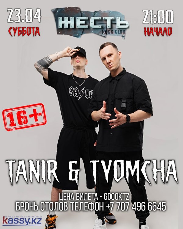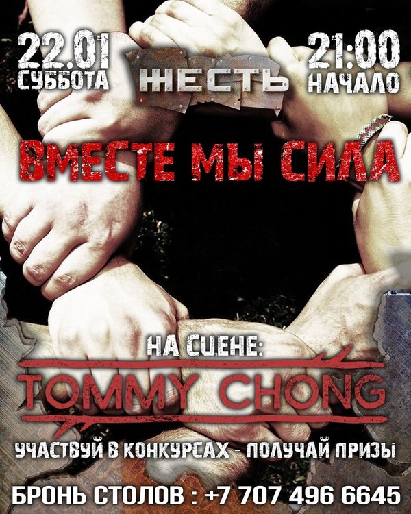 22 января, суббота! ВМЕСТЕ МЫ СИЛА! участвуй в конкурсах — получай призы! На сцене: Tommy Chong Начало 21:00 Так же: MC Роман Лазуров Strip GoGo Dj Rus Вход до 23:00 свободный после, парням — 2000Т, девушкам вход свободный Бронь: Розыбакиева 234