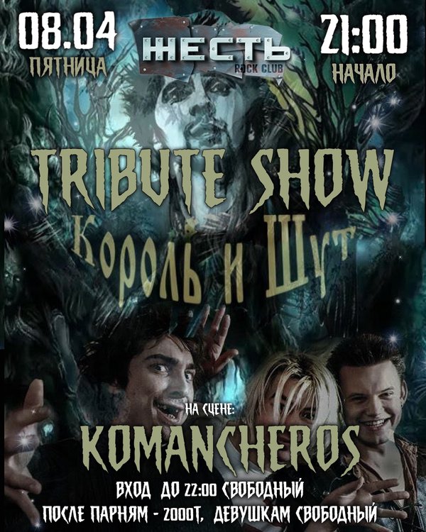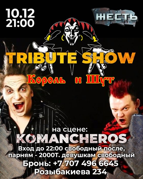 Tribute Show Король и Шут 10 декваря, 21:00 На сцене: Komancheros Так же: Мс Роман Лазуров Strip GoGo Dj Rus Вход до 23:00 свободный после, парням — 2000Т, девушкам — 1000 Интересный факт: У русско-американской группы Red Elvises, играющей в жанрах серф, фанк, рокабилли и фолк, есть совместная песня с Михаилом Горшенёвым «Don’t Crucify Me». Бронь: Розыбакиева 234КиШ