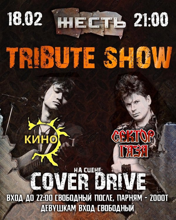 есть!» То ли дело, когда все эти условности возможно совместить с хорошей, настоящей музыкой, близкими по духи и мыслям людьми, в той самой долине, где ушедшие герои, которые до сих пор будоражат сознание еще неокрепших умов и тех, кто еще не забыл, как это, быть молодым? Герои, которые-как и тогда, так и сейчас уводят за собой последователей чести и достоинства. Доброты и благородства! Справедливости, и награды по заслугам, что же, значит и воздаяние за содеянное И эта ночь, сможет показаться сном, только лишь нужно разрешить себе дать волю ногам, чтобы выйти в тот самый мир за окном! В котором еще можно услышать наш смех, который возьмет тебя, и прижмет как родную или родного 18.02.22. – 21:00 @zhest.club #tribute «гр. КИНО» & «СЕКТОР ГАЗА» На сцене: @cover_drive_kz DJ RUS & МС Петр Оборзевский 21:00 – 22:00 #freeentrance 22:00 – 04:00 Мужчины – 2 000KZT 23:00 – 04:00 Девушки заходят беспратно