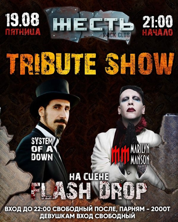 19.08.22. – 21:00 @zhest.club #tributeshow «SYSTEM OF A DOWN & Marilyn Manson» На сцене: Flash Drop #dj DJ Nik.El Петр Оборзевский 21:00 – 22:00 #freeentrance 22:00 – 04:00 Мужчины – 2 000 kzt 21:00 – 04:00 Девушки заходят бесплатно _____ 20.08.22. – 21:00 @zhest.club LampЫ Orchestra #dj DJ Nik.El Петр Оборзевский 21:00 – 23:00 #freeentrance 23:00 – 04:00 Мужчины – 2 000 тг 21:00 – 04:00 Девушки — 1000 тг