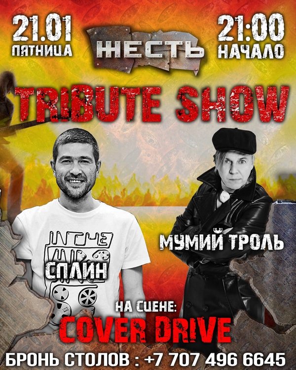 21 января пятница! TRIBUTE SHOW Сплин/Мумий Троль На сцене: Cover Drive Начало: 21:00 Так же: MC Роман Лазуров Strip GoGo Dj Rus Бронь: Розыбакиева 234
