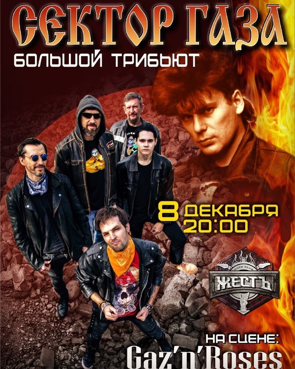 Приглашаем всех насладиться лучшими песнями Юрия Клинских (Хой) и группы «Сектор Газа». Мы собрали фанатский проект — группу «Gaz’n’Roses»! Мы будем всех Вас ждать 8 декабря 2023 года в клубе «Жесть» по адресу: Розыбакиева 234. Концерт состоится в 20:00. Двери открываются: 18:30 Стоимость билетов: 8000 V.I.P. 15000 Вопросы и покупка билетов: клуб «Жесть» Приобрести билет в день концерта Вы сможете в кассе клуба «Жесть». Предновогодний подарок всем ценителям творчества Легендарной группы «Сектор Газа»! Количество мест V.I.P. ограничено.